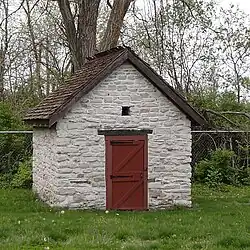 The mansion complex includes a spring house built of cut limestone. Spring houses like that of the Jarrot Mansion contained tubs of cool water in which foodstuffs were protected from spoilage for short periods of time.