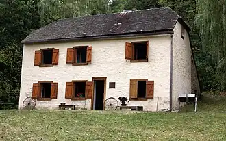 The Nicholas Marnach House is a rectangular, two-story building with a rear lean-to set into a hillside. There is an attic under a half-hip roof, and a partial basement under the east half of the house. The walls are constructed of randomly laid limestone covered by thick stucco, and are up to 3 feet (0.91 m) thick. It has three rooms on each floor, each room having a large square window facing south. Narrow staircases provide access between the floors. The attic has smaller windows on either gable, and a layer of concrete poured over the plank flooring as a form of fireproofing.[3] The house is built in the Quereinhaus style that had become popular in rural Luxembourg in the 1840s.[4] The style includes design features in use since medieval times, such as the mortise and tenon timber framing, massive stone walls, stucco façade, square windows, and half-hip roof.[3]