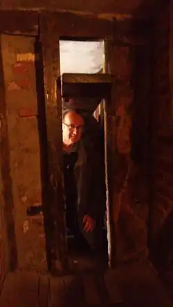 Owen was of very short stature, and suffered from a hernia, as well as a crippled leg from a horse falling on him.[5]: 181, 183 Sometimes, he built a more easily discovered outer hiding place, which concealed an inner hiding place. The location of the secret room was known to only himself and the owner of the house. One certain example of his work survives, at Broad Oaks Manor[6]: 53 and it is extremely likely that Baddesley Clinton is the unidentified house in which seven priests hid in one of his hides during a search in 1591, as the hide and the house match the description perfectly.[6]: 39 Probable examples of his work survive at Sawston Hall in Cambridgeshire, Oxburgh Hall in Norfolk, Huddington Court and Harvington Hall in Worcestershire.[6]: 58, 40, 72, 99 There is no reason to think the turret hide at Coughton Court in Warwickshire is Owen's work.[6]: 234 Due to the ingenuity of his craftsmanship, some may still be undiscovered.