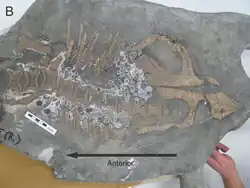 Gastroliths were found in the holotype after they were accidentally exposed when attempting to remove some of the rock surrounding the bottom side of the fossil block with a saw cut. This instead cut through much of the specimen's body, exposing the presence of gastroliths.[6]