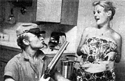 Adams regularly dated actresses with whom he made movies. During the mid-1950s, photographs of him with actress Natalie Wood were widely publicized in fan magazines. Modern Screen wrote at the time "their relationship has been mostly for fun" and they shared "a tendency toward moodiness and unpredictability." The magazine also reported they had given joint interviews "in which they admitted they adored each other" and "they even came terribly close to getting married" in Las Vegas. The same article also remarked that on one of their trips they "posed for innumerable publicity photographs — that was the real reason for the trip — " and "Right now, both Nick and Natalie are inclined to deny the whole Las Vegas episode." In his 2004 biography Natalie Wood: A Life biographer and screenwriter Gavin Lambert wrote in passing, Wood's "first studio-arranged date with a gay or bisexual actor had been with Nick Adams."[45] In his biography of gay Hollywood agent Henry Willson, Robert Hofler deals with the rise of the studio star system, in which several actors spent time on the homosexual casting couch and dated girls or even entered into sham marriages in order to cover their homosexuality. "In the Henry Willson date pool," the author says, "Nick Adams was one client, among many, who glommed on to Natalie Wood to get his picture taken."[46] Suzanne Finstad cites actor Jack Grinnage, one of the gang members in Rebel Without a Cause, about Nick Adams's and Dennis Hopper's reasons "for getting close to Natalie. 'I remember being in Dennis' dressing room with Nick and Natalie ... I don't know which one of them said this — it was Nick or Dennis — but he said, "We're gonna hang on to her bra straps." Meaning up the career ladder.' Natalie's tutor, who knew Hopper and Adams off set, said, 'Both of those two guys were all over her ... because they could see that this movie was going to be a big thing for Natalie ... they were game for anything in order to be noticed and to get ahead in the business.' "[47]