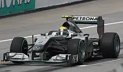 Rosberg finished in third place at the Malaysian Grand Prix, the Chinese Grand Prix, and the British Grand Prix.[28] He scored championship points in all but four rounds; he generally finished higher than he qualified and did so against his teammate Schumacher fifteen times to four that season.[28][39] He was better able than Schumacher to cope with a terminal understeer affecting the MGP W01's handling due to Mercedes forgoing much development work on the car because of Brawn GP's title focus the previous year. The car was five-tenths of a second slower on most circuits.[80] Rosberg was seventh in the WDC with 142 points.[28] His performances during the season enhanced his reputation as a consistent and fast driver.[39]