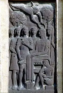 - Cielo d'Alcamo alla corte di Federico II, bas-relief, Porta Palermo of Alcamo, 1961, bronze