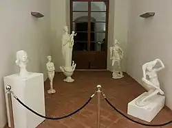 There are also the allegorical figures: "Justice" (bronze bas-relief openwork), "Lady Luck", "Woman with a dove" (plasters), "The winged horse" (a bronze), and finally, the religious themes, like "Mater Ecclesiae" (plaster) and the " Stations of the Cross" with four figures (bronze bas-relief).[5]