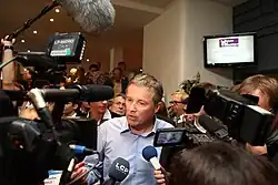 Marine Le Pen pledged in return to appoint him as Prime Minister of France should she win.[44][45][46] The electoral alliance between Debout la France and Front National gathered protesters in Dupont-Aignan's commune, Yerres.[47][48] Dupont-Aignan was also called a "petainist" and compared to Pierre Laval.[49][50] Dupont-Aignan also had dissidents within his own party with his "right hand", Olivier Clodong, resigning.[51] Dominique Jamet, Vice President of Debout la France, resigned as well.[52] Le Pen lost the vote in the second round of the election against Emmanuel Macron.
