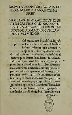 - A Debate Which Took Place Recently in the House of Lorenzo de' Medici the Great (Latin Disputatio nuper facta in domo Magnifici Laurentii Medices), an account of his debates with Dragišić, printed at Florence on 27 July 1489.[11] Dragišić later wrote his own account, which partially responds to Nicolaus' Disputatio.[14] Nicolaus accuses his opponent of heresy.[10]