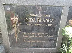 Nida Blanca (born Dorothy Guinto Jones; January 6, 1936 – November 7, 2001) was a Filipino actress whose career spanned five decades. She was one of the biggest box-office draws of the 1950s and rose to stardom with roles in romantic comedies and musical films with frequent on-screen partner Nestor de Villa. She achieved Grand slam in 1987 for her performance in the drama Magdusa Ka!, winning Best Supporting Actress in all four major award-giving bodies in the Philippines. Blanca was a board member of Movie and Television Review and Classification Board in 1998 until her death in 2001.