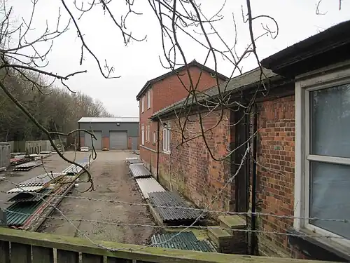 ![]() View south from the former level crossing. Former station building with modern extensions. | |||||