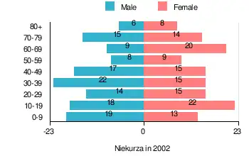 According to the 2002 Poland census, there were 259 people residing in Niekurza village, of whom 49.4% were male and 50.6% were female. In the village, the population was spread out, with 27% under the age of 18, 32.1% from 18 to 44, 14.2% from 45 to 64, and 26.7% who were 65 years of age or older.[2]