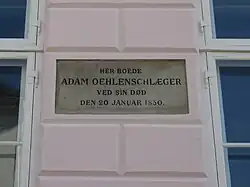 The Niels Aagesen House (Danish: Niels Aagesens Gård), Amaliegade 22, is a property situated next to Amalienborg Palace in central Copenhagen, Denmark. It takes its name after Niels Aagesen, a timber merchant for whom it was built as one of the first then-new district Frederiksstaden. It was then a two-storey townhouse built in undressed, red brick to a design by Niels Eigtved who had also created the masterplan for the district. It was not until the 1840 that it was converted into a four-storey apartment building. It was listed on the Danish register of protected buildings and places in 1945. A plaque on the facade commemorates that the poet Adam Oehlenschläger died in the building on 20 November 1840. Other notable former residents include the naval officer Steen Andersen Bille, Tivoli Gardens-founder Georg Carstensen, medical doctor Ole Bang, diplomat and minister H. E. Reedtz (1800-1857), politician Christian Albrecht Bluhme (1794-1866), General Christian de Meza (1792-1865) and politician Aleth Hansen.