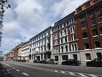 On the southern corner of Niels Juels Gade and Holmens Kanal, a residential property was built according to drawings by Theodor Sørensen in 1865–1866. In 1869, however, it became Hotel Kongen af Danmark. The hotel was well described with a cozy restaurant and many permanent residents. During World War II, however, things went back for the hotel, which was gradually reduced to a pension.[4] Next to it on Holmens Kanal, a new headquarters for Nationalbank was built in 1865–1870. However, there was no more space, so after building an extension on the corner of Havnegadethey began to buy up the adjacent properties between Havnegade, Niels Juels Gade and Holmens Kanal. Initially, they were set up as offices, but the idea was eventually to demolish them in favor of a new bank building.[5]