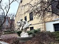 In 1951, David Orton Maxfield completed the sculpture "Teamwork", depicting three football players in the midst of a play, as part of the completion of his Master of Arts degree at Utah. The school's head football coach Jack Curtice consulted on the authenticity of the action and uniforms.[9] The sculpture was installed on the west side of Nielsen Fieldhouse, where it remains to this day.[10]