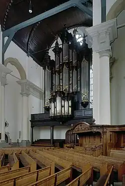 The organ in the Nieuwe Kerk was built in 1831 by Johannes Wilhelmus Timpe based on a design drawing by Petrus van Oeckelen. This is remarkable because Van Oeckelen probably learned the organ-building trade from Timpe. In designing the organ, Van Oeckelen was evidently inspired by the famous front of the main organ of the Grote Kerk in Haarlem by Christian Müller, judging by some of the details. Later, Van Oeckelen and J. Doornbos worked on the organ, whereby the disposition was slightly changed. In the period from 1976 to 1980, it was restored by the firm Ernst Leeflang. A second major restoration followed in 2008–2009.[5] It has 42 registers, divided over main work, back positive, upper work, and pedal.[6] It is located in the organ gallery on the west side of the cruciform church.