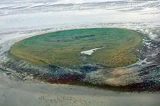 The newly constructed island measured 30 hectares (74 acres) in total area. As pioneer flora began to colonise the island, helping the pre-existing structures to hold down sediments, Nigehörn began to grow naturally into the surrounding tidal mudflats. In this manner, the area of the island has increased over time to approximately 50 hectares (120 acres).[1]