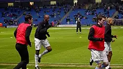 De Jong was given a start against Arsenal on 12 September 2009.[26] He was named Man of the Match by Sky Sports in a 2–1 win over Chelsea on 5 December 2009.[27] By the end of the season he had become a firm fans' favourite as well as being one of new manager Roberto Mancini's first picks as defensive midfielder as the team narrowly missed out on a Champions League berth.[28] De Jong scored his first goal for Manchester City in a 2–1 victory against West Ham United on 1 May 2011.[29]