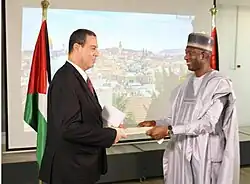 Nigeria supports a two-state solution to the Israel-Palestine conflict.[1] Abu Shawesh is the Ambassador of Palestine to Nigeria.[2] Nura Abba Rimi is the ambassador of Nigeria to Palestine.