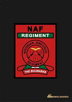 They serve to defend NAF bases, airfields and aircraft as well as protect VIPs.[4] After the attacks by Boko Haram on Nigerian Air Force installations during their insurgency, the command decided to create a specialist unit capable of providing security and protecting the Air Force interests and its bases across the country, in especially conflict zones like the North East, Maiduguri.[5] The regiment is currently operating in internal security operations in 14 states.[6] In early 2021, seven NAF Regiment servicemen died in an ambush by 100 terrorists in Kaduna State.[7]