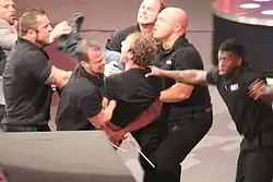 Dean Ambrose being carried out of the arena after attacking Seth Rollins.