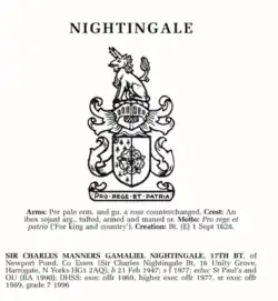 ![]() The Coat of Arms of the head of the Nightingale family: Per pale ermine and gules a rose counterchanged. Crest- An ibex sejant argent tufted, armed, and maned or.[1] | |