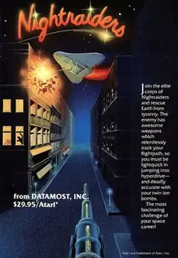 Nightraiders is a scrolling shooter designed by Peter Filiberti and published in 1983 by Datamost for Atari 8-bit computers.[2] It was inspired by the 1982 arcade video game Zaxxon, but scrolls vertically instead of diagonally.