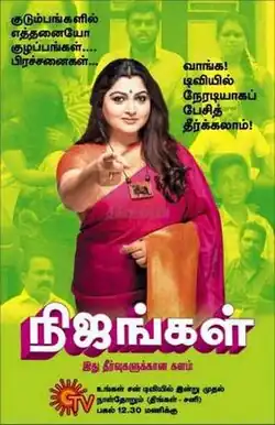 Nijangal (transl. Realities) is a 2016-2017 Tamil-language reality-justice show about real-life situations. It aired every Monday to Saturday at 12:30PM (IST) on Sun TV and was re-telecast Monday to Saturday at 10:00PM (IST) on Sun News replacing previous successful serial Ponnonjual from 24 October 2016 to 4 March 2017 for 218 episodes.[1] The Show host by Khushboo Sundar.[2][3][4][5] The show revolves around real life situations and they try to come up with a solution for the same on the channel. It was Produced by Vaidehi Ramamurthy and director by Mani Sridhar.