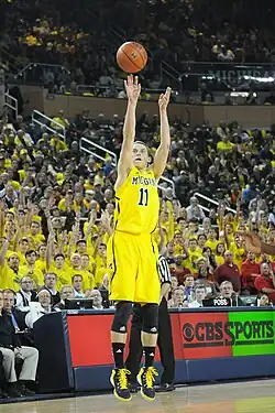 Stauskas began his college career with the expectation that he would be a sharpshooter based on his performance in three-point field goal drills in which he had raised the bar for the team.[27] In the championship rounds of the 2012 NIT Season Tip-Off tournament at Madison Square Garden on November 21 and 23, Michigan defeated Pittsburgh and Kansas State, respectively, to win the tournament.[28][29][30] On November 26, Stauskas earned Big Ten Freshman of the Week honors for his NIT tournament performance in which he averaged 12.5 points and 4.5 rebounds.[31][32][33] On November 27, Michigan defeated its first ranked opponent of the season, NC State (#18 AP Poll/#18 Coaches' Poll), in the ACC–Big Ten Challenge with a then-career-high 20 points from Stauskas in a 79–72 victory.[34] On December 1 against Bradley, Stauskas made his first career regular season start and posted a new career-high 22 points.[35][36] For his first two 20 point performances, he repeated as Big Ten Freshman of the Week on December 3.[37] On December 29, against Central Michigan, Stauskas posted 19 points on 5-for-8 three-point shooting. His 5 three-pointers and 7 rebounds were career-highs, earning him his third Big Ten Freshman of the Week on December 31.[38][39]