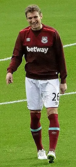 On 1 September 2015, Jelavić signed a two-year contract with West Ham United with an option for a further two years.[41][42] He made his West Ham debut on 19 September, coming on as a 69th-minute substitute for Manuel Lanzini in a 2–1 away win against Manchester City.[43] He scored his first goal for the club in an FA Cup tie against Wolverhampton Wanderers on 9 January 2016.[44]