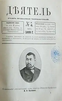 Nikolai Fedorovich Katanov was elected Secretary of the Society of Archaeology, History and Ethnography - OAIE - at the university less than two months after his arrival in Kazan on 8 April 1894.[48] Katanov was involved in various activities, including organizing the Society's library, editing its Izvestiya, and publishing the Society's reports and meeting minutes for the first time. In 1897, due to the difficulty of balancing his teaching responsibilities with his work for the Society, Katanov requested to be relieved of his duties as secretary. However, in 1898 he was elected as the chairman of the OAIE.[49] On 19 March 1900, he wrote to V.V. Radlov expressing his frustration with the difficult relationships he sometimes had with his colleagues in the Society: