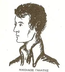 Nikolaos Galatis (Greek: Νικόλαος Γαλάτης; c. 1792 – 1819) was a Greek pre-revolutionary figure from Ithaca and one of the founding members of the Filiki Etairia, the secret revolutionary society.[1][2] He was initiated into the society by Nikolaos Skoufas in Odessa,[3] and in turn he initiated many others into the revolutionary society, some of whom became important figures in the events of 1821.[4][3] Despite his efforts in promoting the society in its early years, he was accused of various misdemeanours and follies, and was eventually assassinated by other members of the society just a few years after joining.[5][6][7][8][9][2]