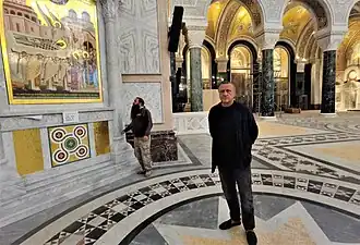 Mukhin visited the Temple of Saint Sava for the first time 1994 in official company of Patriarch Alexy II of Moscow who held service with Patriarch Pavle. Mukhin later worked in Serbia in various church decorations from 2002. Prior to Saint Sava, his main work in Serbia was the decoration of the church in Ub (Crkva Vasnesenja Hrista) which had to be built anew after an earthquake shook the Kolubara basin in 1998 and where he worked from 2003. He then was a member of the board of cultural advisors to Putin, whom he had known since the early 2000s.[7] He explained that in 1994 his first idea came to decorate Saint Sava. As the church encloses an immense space, he stated that for him a golden decoration was the only possibility and that it signified the Transfiguration of Jesus. His main task, he said, was to make the church interior shine from its golden surfaces, he as author saw it as symbol to transfiguration. The impression of the light as a medium of sacral illustration will also be enhanced by illumination of certain scenes according to the church calendar. An impulse in the lighting will change from warm to cool tones, dependent on the religious feast. The smelt of the Tessara was made in Moscow and for the golden and silver Tesserae, pure gold and silver were used. Despite having worked in the Moscow Cathedral of Christ the Saviour, the task in decorating Saint Sava was of different magnitude, as the dome and size of scenes are much larger and the artistic media more complex. His competition entry for the mosaic compositions in the Temple of Saint Sava was chosen from among approximately 50 competitors. His proposal was described as: "the artist uses a specific iconography which reaches back to the Byzantine and Serbian art and creates compositions which redefine the interior of a modern sacral space".[8] Together with fellow Yevgeniy Nikolayevich Maksimov (b. 1948), director of the department of painting at the Russian Academy of Arts,[9] a 1:10 scale model of the dome was made and installed at the Russian Embassy in Belgrade.[10] The mosaic of the dome in the Church of Saint Sava was revealed by Sergey Lavrov during his state visit to Serbia 22 February 2018.[11] The high symbolic value of the mosaic decoration was addressed at the same inaugural event by Hilarion (Alfeyev): “The mosaic decoration for the main cathedral of the Serbian Orthodox Church is a gift from Russia and its President, from the Russian artists and the Russian Orthodox Church led by her Patriarch, to the Serbian Orthodoxy. For many centuries to come it will be for future generations a sign of fraternal love between the Russian and the Serbian Orthodox Churches and the peoples they shepherd.”[12] As of February 2020 a great deal of the mosaic works in the church of Saint Sava has been finished. The main motiv of the four apses are the life of christ with a central figure of the blessing Christ in the eastern apse spanning 17 m. The mosaics are reminiscent of Byzantine works from the 11th and 12th century in Southern Italy (Palermo, Monreale) and Venice. For the ground colour, gold tessera with pure gold are used, as gold symbolizes the transfiguration of Christ. 3000 workers participate in the laying of approximately 13.000 m² mosaic surface works, which will form the biggest mosaic ensemble ever executed. Among his other work for the Sava church he designed the main wheel chandelier in the space under the dome, with a diameter of 20 m and weight of 14 tonnes (the biggest wheel chandelier in any existing church).[13]