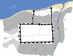 Two other Roman forts on the Danube were nearby to the west: Securisca (3 km) and Ansamus (5 km).[3] A garrison of one of these was ala Bosporanorum milliaria, a nominally 1000-strong cavalry regiment stationed there before the time of Claudius (r. 41 to 54).[4] Anasamus is included in the Notitia Dignitatum with the garrison of the military unit milites praeventores[5] dating to 378 AD, and where there was also a mansio included on the Tabula Peutingeriana dating from the 3rd c. AD. These milites praeventores are the only unit of this type recorded in the Notitia Dignitatum, and was a special regiment for active defense, including surprise actions, of the border sector.