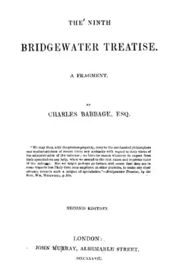 The Ninth Bridgewater Treatise was published by the mathematician and inventor Charles Babbage in 1837 as a response to the eight Bridgewater Treatises that the Earl of Bridgewater, Francis Henry Egerton, 8th Earl, had funded. The Bridgewater Treatises were written by eight scientists and purported "to lend scientific support to belief in the existence of deity."[1] Babbage was not one of the invited scientists, and the Ninth Bridgewater Treatise was thus an unauthorised continuation of the series.[2]