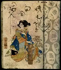 It was the best-selling example of the genre known as gōkan (合巻), a popular literary form that merged image with text.[3] The plot centres on the outlandish adventures of Ashikaga Mitsuuji, second son of Ashikaga Yoshimasa, while seeking to recover a stolen sword, mirror, and poem, upon which the security of the realm depend.[3] The preface to the first chapter introduces the character Ōfuji, whose nickname is Murasaki Shikibu.[3] In the preface to the tenth chapter, Tanehiko describes his own literary project:[1]