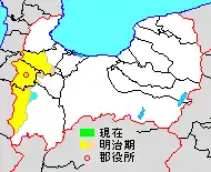 * yellow - areas formerly within the district borders during the early Meiji period