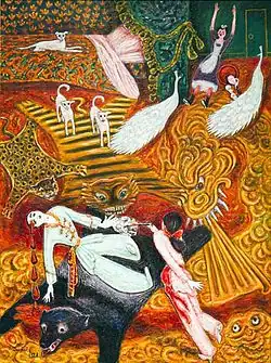 "Nita" Wallenberg appears in some of Dardel's work, including Yngling i svart, Flicka i vitt from 1919, Vattenfallet from 1921, and Ynglingen och flickan from 1919.[5] Two of his best-known paintings, Visit hos excentrisk dam and Crime Passionnel, have her as a quintessential point figure.[5] In the oil painting Exekution, from 1919, Nita's father appears as a hardened executioner who kicks a young man over a steep hill.[6]