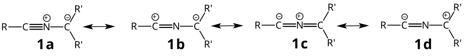 The most appropriate resonance structure is dependent upon the substituent pattern (the identity of the R and R′ groups). The 3-dimensional structure of the nitrilium ylide itself may also provide a clue as to the most appropriate resonance structure, with a linear R–C≡N–C unit supportive of the charge distribution indicated for resonance structures 1a & 1b and also consistent with the nomenclature nitrilium ylide. As resonance structures 1c and 1d become more important the nitrilium ylide distorts its geometry from linear in favor of a different valence tautomer 2 that is distinctly bent: