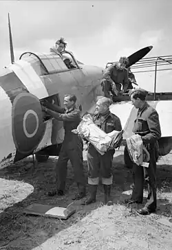 Commanded by an experienced fighter pilot, Squadron Leader James Storrar, the flight was part of Transport Command's No. 46 Group. As the unit was potentially to operate close to the front-lines, an armed fighter was deemed necessary to equip the flight. Accordingly, the Hawker Hurricane fighter was selected. This was a monoplane aircraft that first entered service with the RAF in December 1937, but by 1944 was no longer suitable for front-line service in Europe. The flight used Hurricane Mk IICs, which had four cannons, and these were modified to take 31 cubic feet of mail and packages. It had a range of 350 miles, more than enough to fly to Normandy and back, and this could be extended with underwing drop tanks.[2][3]