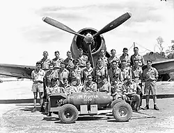 The squadron was formed in November 1943 equipped with the P-40 Kittyhawk, and was deployed to Guadalcanal from February 1944.[1] In March that year, it relieved No. 18 Squadron on Bougainville, flying patrol and ground attack missions against Japanese forces.[2] It was regularly rotated between Guadalcanal and operations from Bougainville until November when it moved to Emirau Island in the Bismarck Archipelago, where it provided day fighter defence until January 1945.[3]