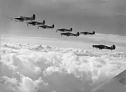In May 1941 the squadron left for the Middle East its aircraft being flown off HMS Victorious to Malta while the ground echelon sailed round the Cape of Good Hope. 28 Hurricanes of 238 flew to the island and as soon as refuelling had been complete flew seven hours to eastern Egypt.[75] After refuelling in Malta the Hurricanes flew on to the Western Desert where they were attached to No. 274 Squadron on 15 June 1941, pending the arrival of the squadron's own ground crews.[76] 238 operated from LG 109 alongside 1 Squadron SAAF from 20 October 1941. They escorted six Blenheims from 113 and No. 55 Squadron RAF to Gambut. II/JG 27 intercepted and shot down two Blenheims, two 238 Squadron pilots and one 1 SAAF pilot. Sergeants Savy baled out and Knappett crash-landed, though he returned to the unit later. The South African pilot was captured. Another Hurricane was lost in action with this unit on 30 October.[77] From 17 November 1941, 238 was assigned to 258 Wing for the upcoming Operation Crusader.[78]