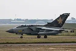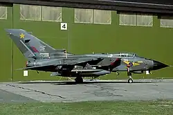 No. 31 (Designate) Squadron was formed in September 1984, when the unit took delivery of Panavia Tornado GR.1s at RAF Brüggen.[33] The Goldstars completed their conversion from the Jaguar on 1 November 1984.[10] The squadron's assignment to SACEUR and its war role did not change, although the squadron's allocation of WE.177 weapons increased to eighteen to account for the greater capacity of the Tornado, which could each carry two nuclear weapons, and the ratio of weapons to aircraft at full strength increased to 1.5 : 1.[34] The apparent mismatch between aircraft numbers and WE.177 numbers is explained thus: RAF staff planners expected up to one third attrition in a conventional European high-intensity war, and some aircraft were to be held back in reserve to ensure that if a conflict escalated to use of tactical nuclear weapons, there were sufficient aircraft surviving to deliver the squadron's full stockpile of eighteen nuclear weapons.[35]