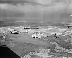 The squadron returned to operations in January 1944 and returned to its anti-shipping duties, targeting merchant vessels, loaded with supplies for the German war effort and often accompanied by flak ships, steaming along the Norwegian coast.[16][19] On the squadron's first sortie with the Beaufighter, it attacked a convoy of ships near the southern coast of Norway. A merchantman of around 12,000 tons was sunk before a group of Messerschmitt Bf 109 fighters saw off the attackers. Another ship, spotted earlier in the sortie, was strafed and badly damaged.[20]