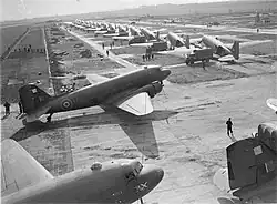 No. 512 Squadron was formed on 18 June 1943 from the Dakota element of 24 Squadron at RAF Hendon. It operated on supply routes from the United Kingdom to Gibraltar and Algeria to support the campaign in North West Africa. It also flew internal routes within the United Kingdom, and to the Azores and India. In February 1944 the squadron changed role and was transferred to No. 46 Group at RAF Broadwell; it was now a tactical Dakota squadron and started training glider towing and parachute dropping. Its first operation in the new role was a leaflet drop on 5 June 1944 over France, this followed intensive flying in and out of France including dropping parachutists at Arnhem. In fact, 512 Squadron can claim that they were the first planes over on D-Day as three Dakotas piloted by Fl Lt Hyde, W.O. James Proctor and a C Flight Flying Officer dropped a specialist team at 00.02 on 6 June to try to disrupt the Merville Battery before the main assault. It suffered losses during Operation Market Garden and was withdrawn to operate a transport service from Brussels in March 1945, although it was still involved in airborne operations associated with the Rhine crossing. After VE Day in July 1945 it extended its trooping routes to Palestine and the Middle East and moved to RAF Qastina in Palestine in October 1945, moving on by the end of the month to RAF Gianaclis near Alexandria, Egypt. In December 1945 it moved to Bari, to operate scheduled flights within Italy. It returned to the United Kingdom in February 1946 and was disbanded upon arrival on 14 March 1946.[1][2][5]