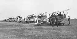 The squadron moved to Shawbury the day after it was formed and then to Ternhill on 29 June. It became part of the 1st Training Wing on 1 September, when that unit was established to command the four AFC training squadrons in England (the others being No. 5, No. 7 and No. 8 Squadrons).[4] In January 1918 the squadron was redesignated No. 6 Squadron AFC; the other AFC units were also renamed at this time.[3] No. 6 Squadron moved to Minchinhampton on 25 February.[3] The squadron used several types of aircraft to train pilots, including the Bristol Scout D, Sopwith 1½ Strutter, Sopwith Pup, Avro 504, Airco DH.5, Royal Aircraft Factory S.E.5 and Sopwith Camel.[5] While most of these aircraft types were obsolescent and suitable only for elementary flight training, the S.E.5s, Sopwith Pups and Sopwith Camels were up to date and in service with combat units in France.[6]