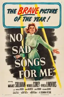 No Sad Songs for Me is a 1950 film directed by Rudolph Maté,[1] featuring Margaret Sullavan in her last film role as a woman dying of cancer. It was nominated for an Academy Award for Best Music Scoring in 1951. The sentimental film is known as a post-war Hollywood tearjerker.[2]