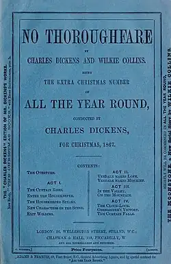 In 1867 Charles Dickens and Wilkie Collins collaborated to produce a stage play titled No Thoroughfare: A Drama: In Five Acts.[1] The two had previously collaborated on the play The Frozen Deep. This was the last stage production to be associated with Dickens, who died in June 1870. The play opened at the Adelphi Theatre on 26 December 1867.