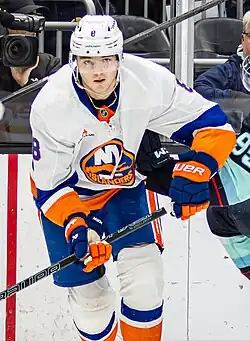 During the 2021–22 season, Dobson recorded 51 points through 80 games played.[13] That off-season, he would agree to a three-year extension with the team.[14] In April 2024, Dobson became the second defenceman in franchise history to record at least 60 assists in a single season.[15] Collectively, he finished the 2023–24 campaign with 70 points, becoming the first Islanders defenceman to reach this plateau since Denis Potvin in 1983–84.[16]