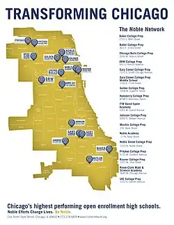 Noble Schools (formerly known as the Noble Network of Charter Schools and as Noble Street Charter School) is an open enrollment, public charter network of high schools and middle schools serving students throughout Chicago. Noble was co-founded in 1999[2] by Michael Milkie and Tonya Hernandez through a partnership between Ron Manderschied, President of Northwestern University Settlement House.[3][4] Noble's first expansions, Rauner College Prep and Pritzker College Prep, opened in 2006. There are currently 18 schools in the charter school network: 1 middle school and 17 high schools.[5] Noble schools are public and open to all students in Chicago and there is no testing required for admission.[6]
