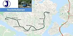 Nockebybanan (lit.'the Nockeby Line') is a tram/light-rail line between Nockeby and Alvik in the western suburbs of Stockholm, Sweden. The 5.6 kilometers (3.5 mi) long line is part of the Storstockholms Lokaltrafik public transport network, and connects with the Stockholm metro and Tvärbanan tram at Alvik metro station. The Nockebybanan, also known as line 12, is operated by Stockholms Spårvägar.