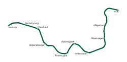 Nockebybanan has a single line (line 12) with ten stops, running from Nockeby to Alvik in Bromma borough. At Alvik metro station, passengers can use the cross-platform interchange provided to change to the Stockholm metro green line (lines 17, 18 and 19), or they can change to Tvärbanan (line 30 and 31) at lower level platforms. The tramway is separated from roads, but has some level crossings.[3] The journey time from Alvik to Nockeby is 14 minutes, with service intervals varying between 6 minutes in the morning and evening peaks, and 20 minutes during the evening and weekend.[4] Typical weekday traffic is around 11,800 boarding passengers (as of 2019).[2]