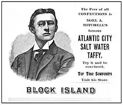 Noel Mitchell, the son of Mary Jane and Edward Mitchell, was born on January 9, 1874. Coming from a humble background, Mitchell attended public school in Rhode Island and later enrolled in a course in business college.[1] In 1892, Mitchell’s climb to success began with his creation of a successful business venture in the sale of salt water taffy. Advertised as "a mixture of easy-flowing sweetness and the salty Atlantic Ocean",[2] Mitchell carefully crafted his brand. On every box of taffy sold, Mitchell's face was featured prominently in the center to increase his notoriety (later he would use his candy to advertise St. Petersburg by including post cards within every box). Mitchell also offered to ship his taffy nationwide for a flat fee of 40 cents, making it affordable to purchase and easily attainable outside the immediate area. Soon, no longer was Mitchell's brand limited to Atlantic City and the surrounding area. Instead, Mitchell's brand was becoming a nationally recognized product, sold in states all over the nation.[2]